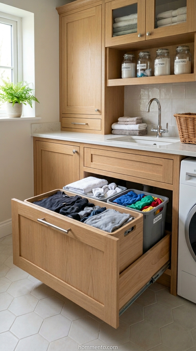 I’m done with the plastic baskets taking over my hallway. My plan is to have four deep, sliding bins hidden right behind the cabinets—one for whites, one for darks, one for gym clothes that smell like a locker room, and a small one for stuff I’ve already ruined.