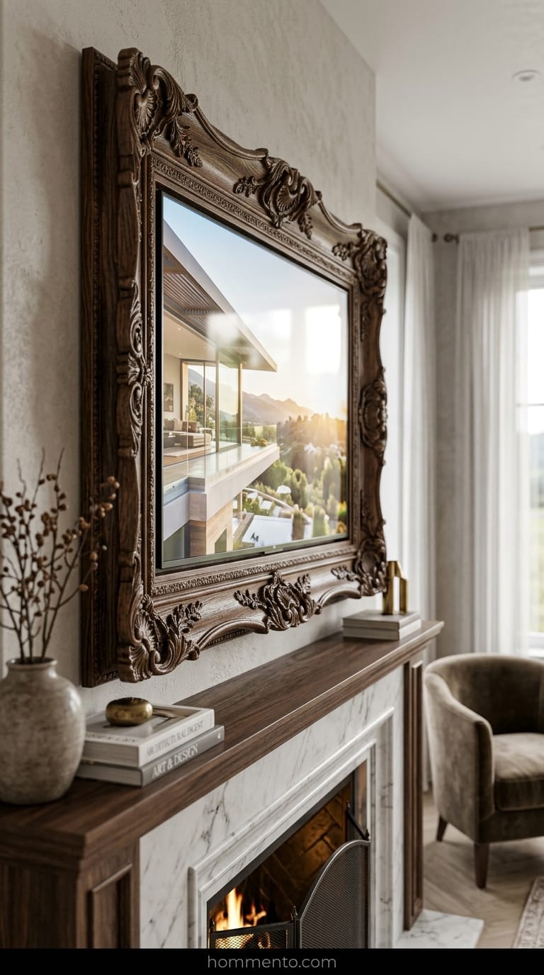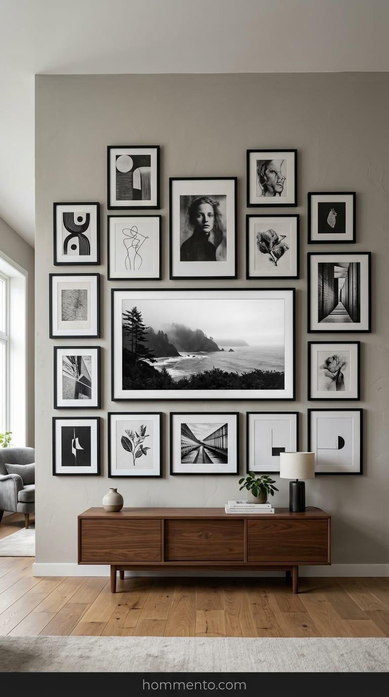 Seriously. Just surround it. It hides the “black mirror” effect that usually kills the vibe of a nice room. Use black-and-white photos or weird sketches to keep it from looking like a cluttered mess.