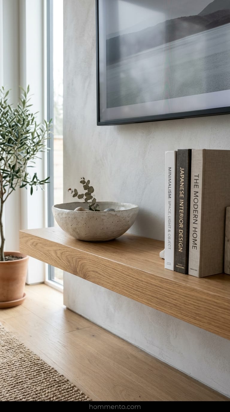 Shelves around a TV are usually a disaster zone for clutter and dust bunnies. I’ve seen people put fifty tiny photos and candles next to their screen and it makes my brain hurt. Too much visual noise.
