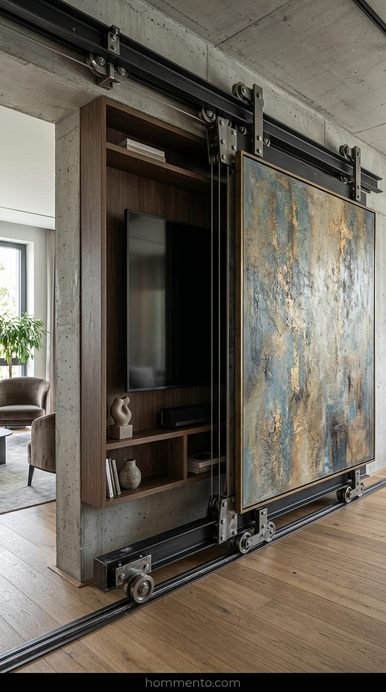 I hate looking at a giant black rectangle when the TV is off. It’s a void. One guy I know installed these sliding tracks behind a massive thrift store painting. You slide the art to the left, and boom—Netflix.